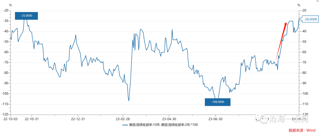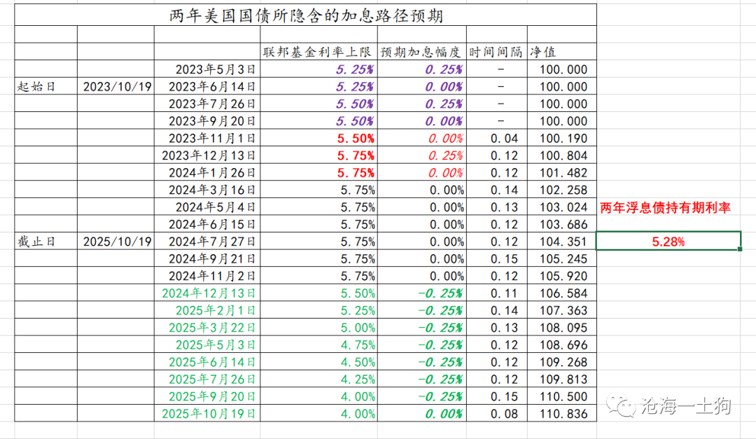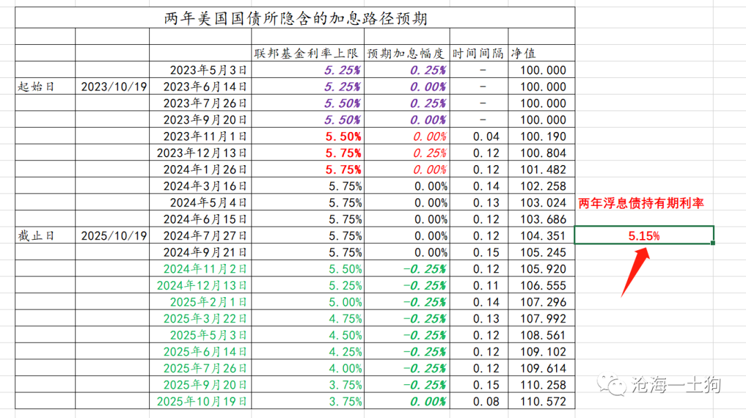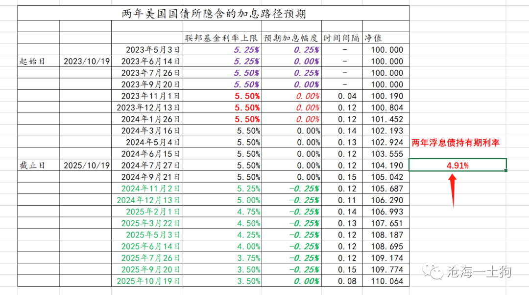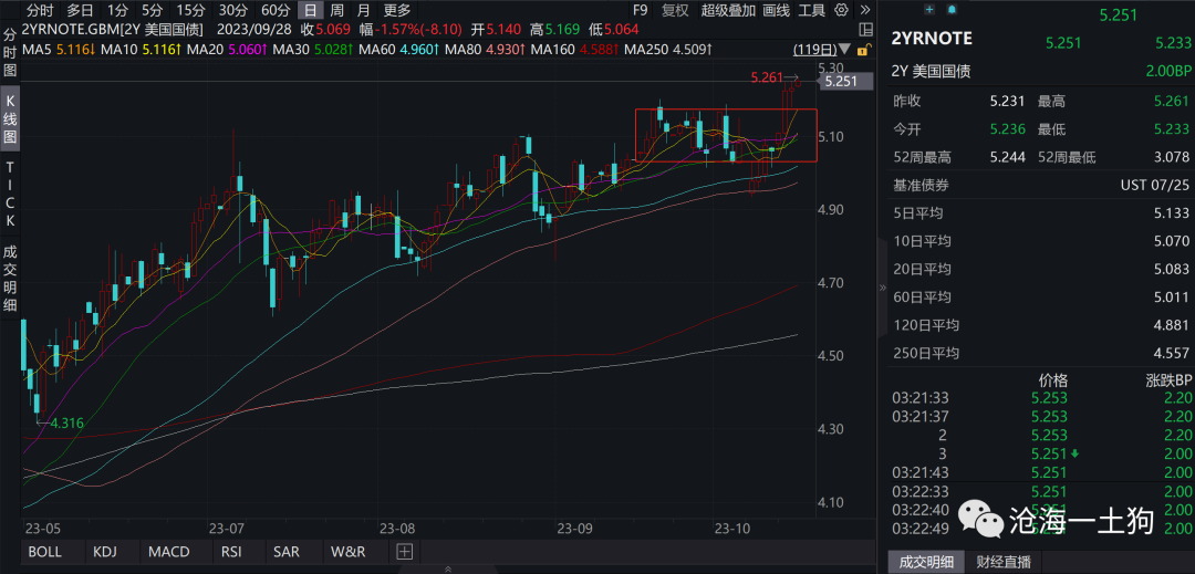 根据对照表,这个路径预期所对应的两年美债利率在5.15%。九月议息会议之后,两年美债利率基本上围绕这个中枢波动。