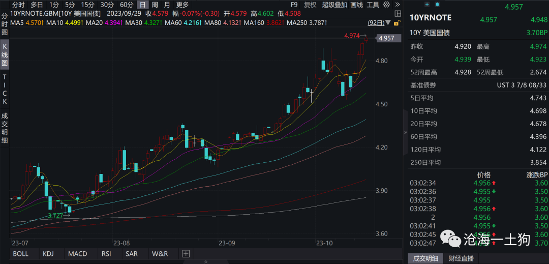 最近,全球的流动性形势恶化得比较快,十年美债的利率中枢已经攀升至4.95%附近。