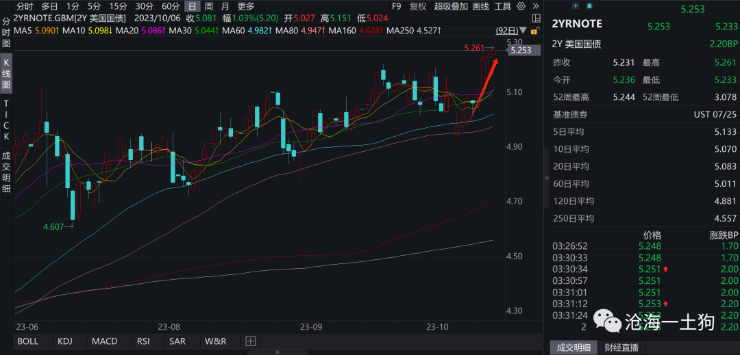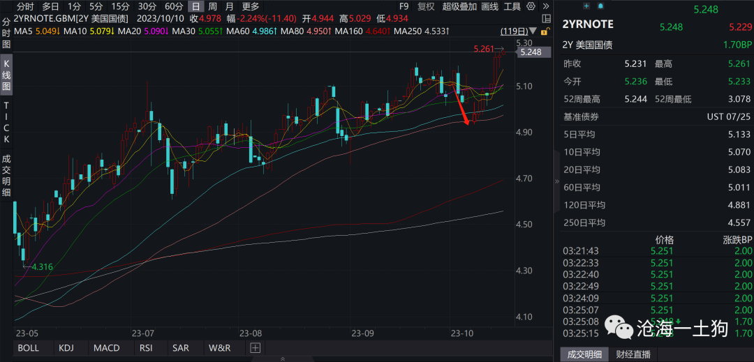 市场开始恐慌,大幅上调加息的展望:1、通胀数据使得两年美债回归5.15%;2、零售数据使得两年美债上到5.25%。