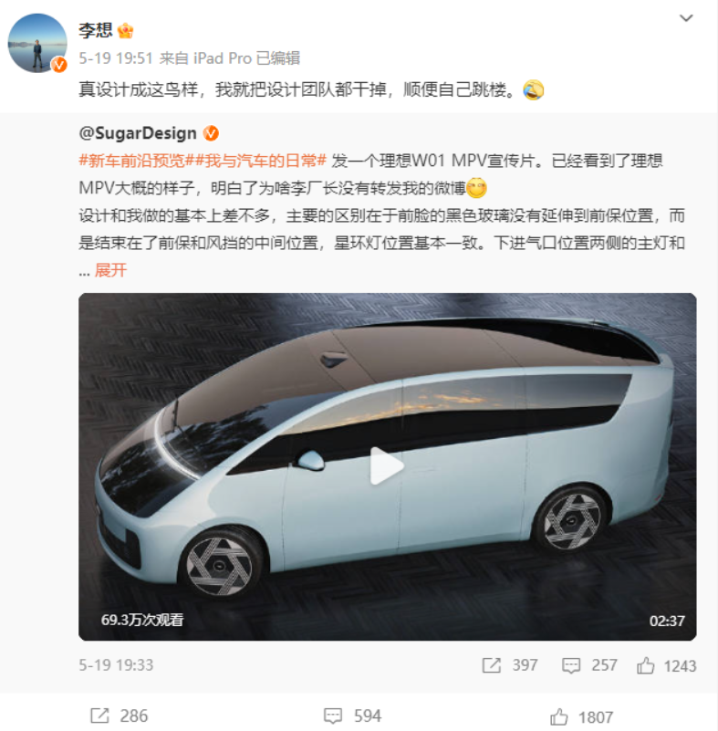 随后,李想转发微博锐评:真设计成这鸟样,我就把设计团队都干掉,顺便自己跳楼。