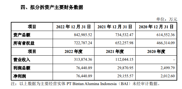 拟分拆资产位于印尼廖内群岛省宾坦岛东南部卡朗巴唐区,毗邻新加坡,是新加坡印尼经贸合作的前沿地带,地缘经济优势明显。其于2018年开工建设,2021年一期100万吨氧化铝项目建成投产,2022年全面建成年产200万吨氧化铝项目并投产。其采用世界先进的拜耳法生产工艺及国际先进的装备,生产冶金级砂状氧化铝粉。