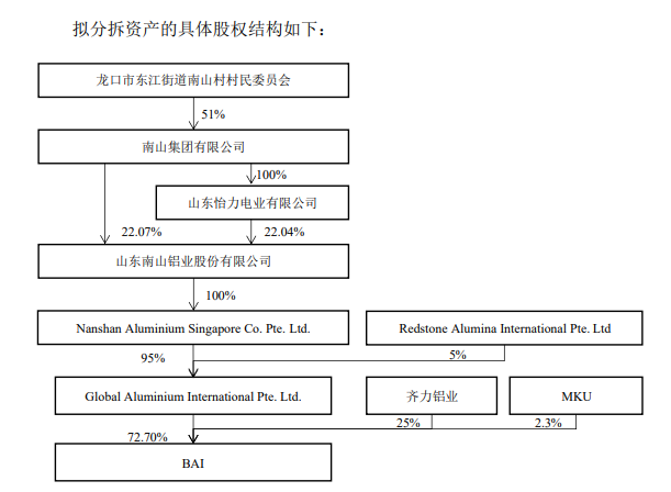 拟分拆资产于印度尼西亚从事氧化铝的生产及销售,依托于印度尼西亚本土的铝土矿资源优势,在廖内群岛省宾坦岛独立开展采购、生产、销售等主营业务必要活动。本次分拆完成后,南山铝业国际将进一步深耕印度尼西亚及周边市场业务,持续开拓印尼铝土矿资源优势。分拆完成后,南山铝业股权结构不会发生变化,且仍将维持对南山铝业国际的控制权。