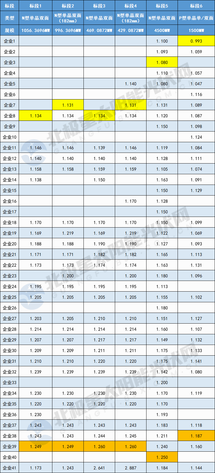 公开信息显示,此次共有41家企业参与投标。从投标报价来看,六个标段的平均价分别为1.194元/W、1.198元/W、1.196元/W、1.195元/W、1.152元/W、1.103元/W。其中,N型组件最低投标价为1.08元/W;P型组件最低投标价0.9933元/W,由标段六报出。这也是组件价格首次跌破1元/W。