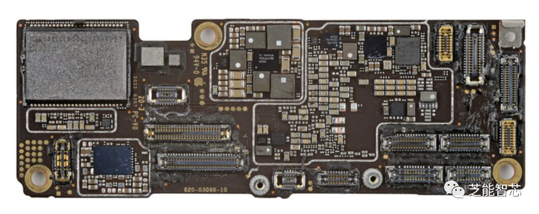 ● 主板正面:苹果正面主板PCB,主要包含苹果自研芯片3块,德州仪器的电源和控制器芯片和一块NAND Flash