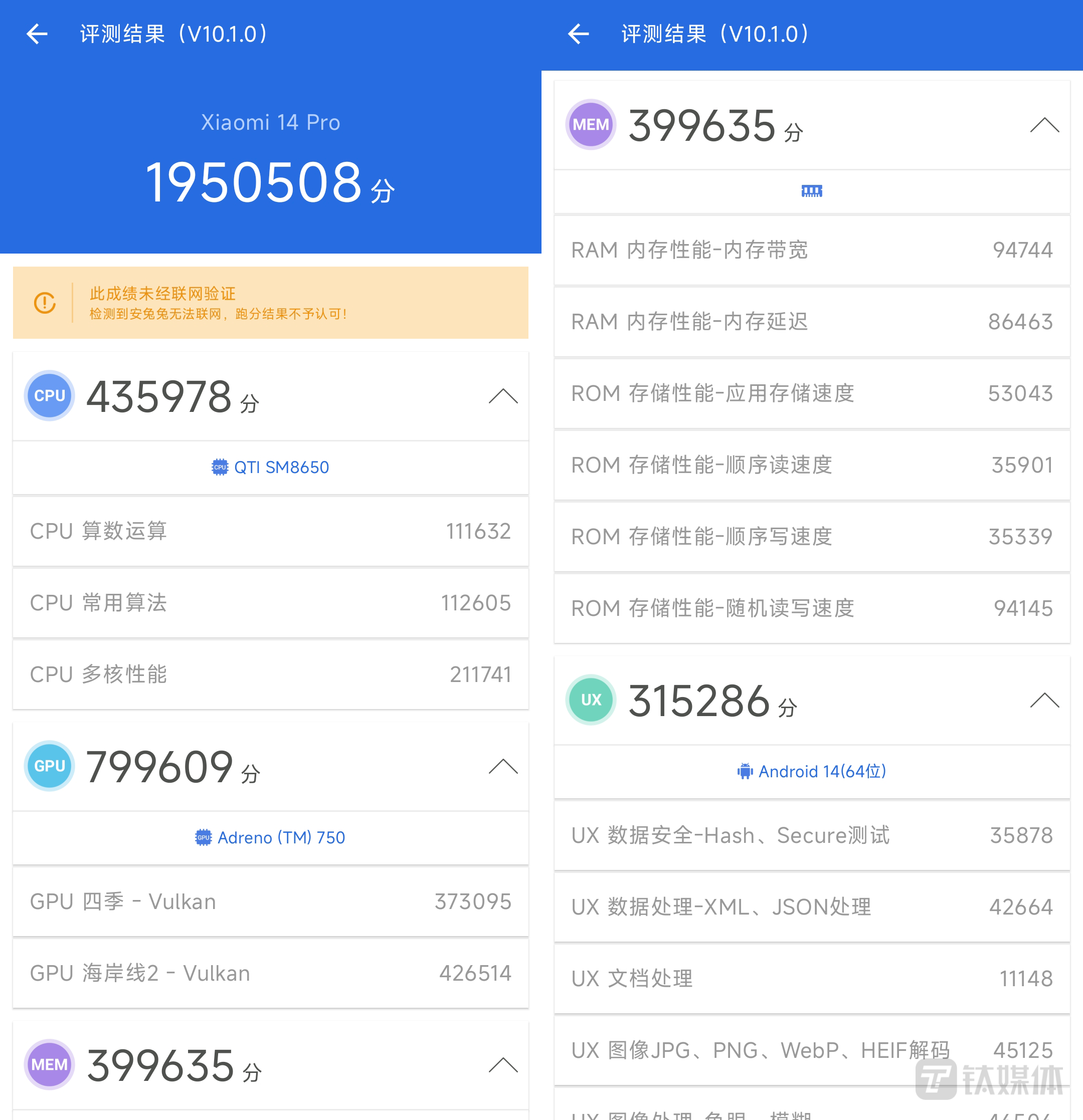 小米14 Pro采用的高通骁龙8 Gen3 SoC,采用全新1+5+2核心架构、ARM新一代IP以及64位指令集,CPU、GPU提升高达30%和35%。从跑分来看,在室温条件下开启高性能模式,小米14 Pro的安兔兔得分达到了195万。相比骁龙8 Gen2有着明显的提升。
