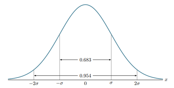 若有一个随机变量,则变量服从期望值为 0、标准偏差为 1 的正态分布,且多次测试该变量的结果在−1 到 1 之间的概率为 68.3%,在−2 到 2 之间的概率为 95.4%。