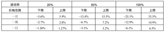 下表是上表中数字换算为百分比的结果,表示当已知标的资产波动率时,标的资产相应的涨跌幅,涨跌幅不完全一致是因为 B-S 模型中标的资产服从对数正态分布的基本假设。
