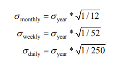 实际上大部分期权距离到期日都只有 1 个月,并不会去关注 1 年后标的资产的价格,所以在进行期权交易时更应该关注的是 1 个月后、1 周后或 1 日后的标的资产的价格分布。因为历史波动率为年化求出的值,所以在参考它时需要调整期间。1 年大概有 250 个交易日,所以年化波动率的值实际上是乘以√250(»16) ;如果是 1个月后的股价分布,则需要年化波动率值乘以 1/√12(»0.289»1/3.5);如果是 1 周后的股价分布,则需要年化波动率值乘以 1/√52(»0.139»1/7.2)(一年大概有 52 周); 如果要看 1 日后的股价分布,则需要年化波动率值乘以 1/√250(»0.063»1/16) ,具体公式如下: