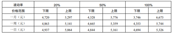 下面通过市场中的实际数据来分析波动率对标的资产价格变化的影响,下表给出了当前股价为 5000 元,且波动率分别为 20%、50%、100%时,概率在 68.3%的各期间的股价范围。