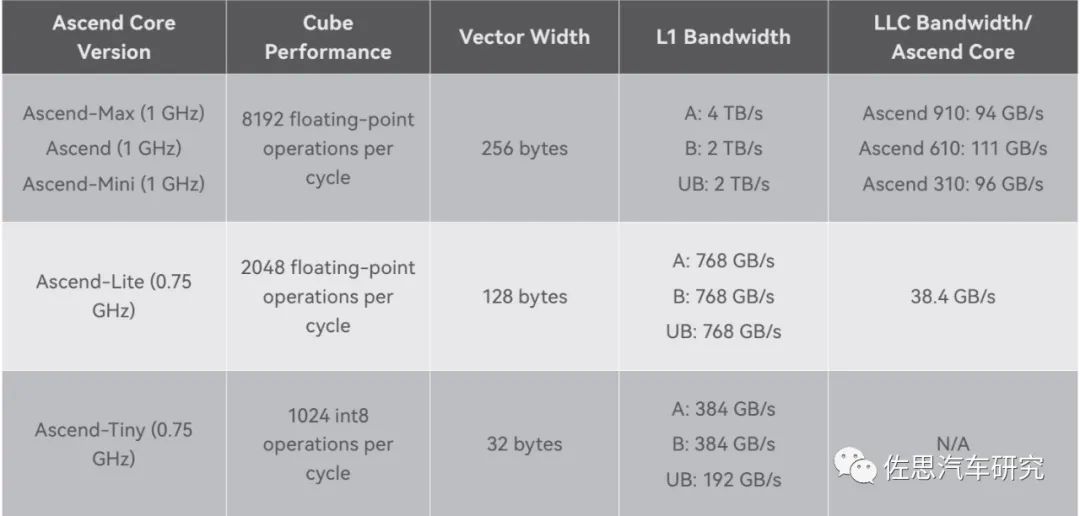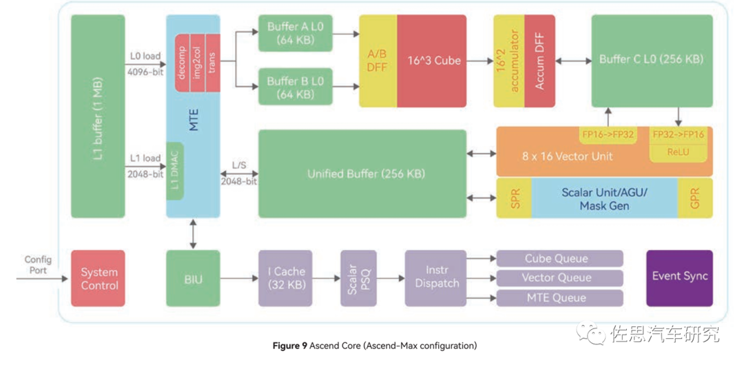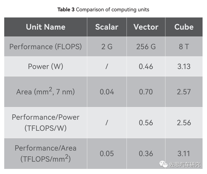一个CUBE核是8TOPS@FP16的算力,注意是FP16不是常见的INT8,车载领域一般是INT8。一个CUBE内部包含4096个FP16 MACs,8192个INT8 MACs,而一个MAC是包含两个Ops,因此如果运行频率是1GHz,那FP16算力就是1G*2*4096=8T。