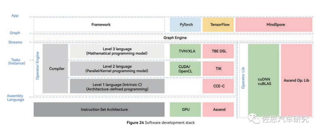 上图是升腾的软件开发栈,CUDA还是必须使用,算子库还是常见的cuBLAS,英伟达的GPU此时会更占优势。