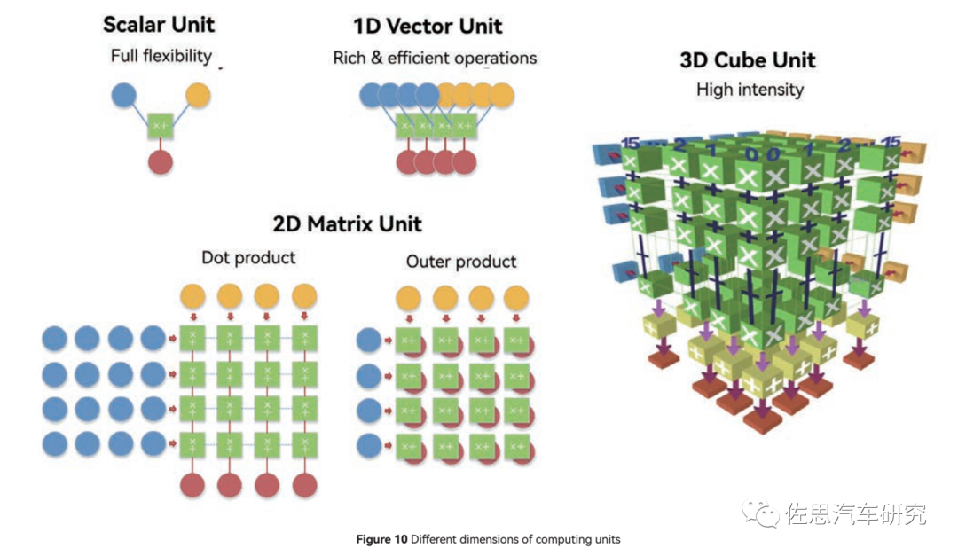 标量基本近似CPU,灵活性最高,但针对AI运算力最低。1D矢量近似于GPU,灵活性居中,AI算力中等,CUBE针对2D矩阵,也就是一般意义上的张量。
