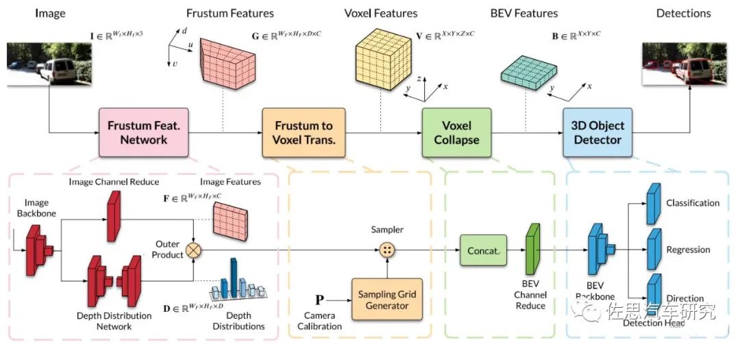 零跑的EA-LSS核心还是来自英伟达的LSS,即Lift-Splat-Shoot。自从BEV下的感知在Tesla AI Day 被提出后,业内很多公司开始进行BEV工程化的探索。当前在BEV下进行感知方法大致分为两类:一类是以Transformer为主体的隐式深度(Depth)信息进行转换的架构,典型代表为特斯拉;另一类则是基于显示的深度估计投影到BEV下的方法,也就是英伟达在2020年初提出的LSS。有关LSS,详情见论文《Lift, Splat, Shoot: Encoding Images from Arbitrary Camera Rigs by Implicitly Unprojecting to 3D》。