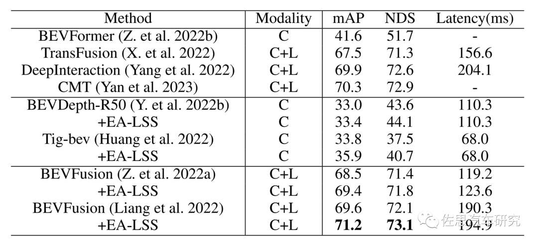 EA-LSS实测得分,目前处于全球第一的位置,TransFusion就是华为自动驾驶的融合算法。EA-LSS也可以用单目估计深度,不用激光雷达,不过性能非常差,mAP大致就是33%。