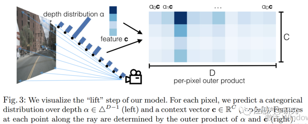 这是cuDNN (CUDA Deep Neural Network library) 对LSS的改进流程,多视角相机输入后,进入Backbone,同时利用一个深度估计网络估计出Depth的feature。值得注意的是,这里的Depth feature与 Image feature 的size 是相等的,因为后续要进行外积(Outer product)操作。外积是LSS的核心。