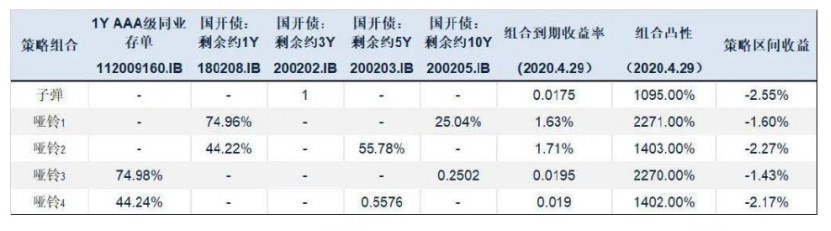 从结果来看,杠铃策略的收益率在牛平阶段大多数超过了子弹策略,而对比杠铃策略中的4中组合的话,一年期+五年期的组合表现要好过1年期+10年期的。[Observation]
