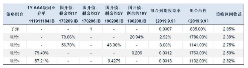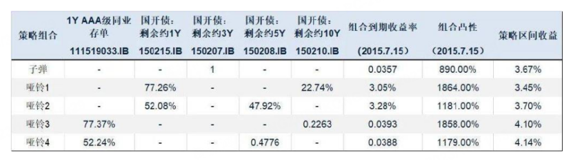 在这一时期,子弹策略集中配置3年期债券品种,久期为2.51年,再以2.51年为目标久期,构建了4种杠铃组合。在相同的久期之下,子弹策略具有较高的到期收益率,而杠铃策略则是以收益率为代价,分散配置则带来了更高的稳定性。