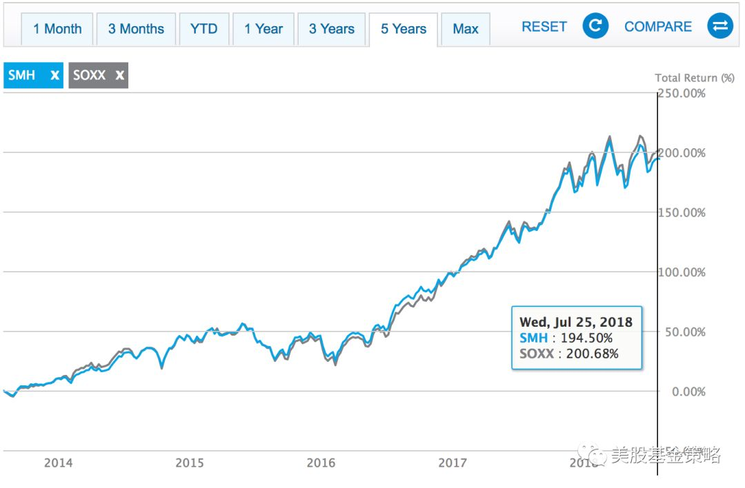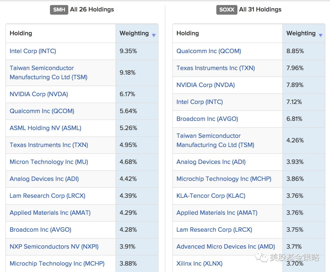 我们可以看到,其实优秀的半导体公司就那么些,两只ETF的区别主要在于仓位占比差异较大,比如英特尔、台积电、高通、德州仪器体现的就非常明显。