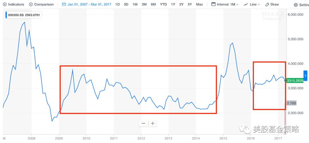所以,定投国内指数依然是不错的选择,咱A股就这特点,牛短熊长,熊的时候还依然波动巨大,中间来波行情,马上又下去,我们对比下沪深300指数在2008年到2014年之间和现在的情况: