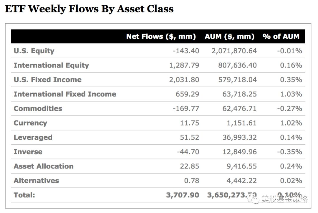 在刚刚过去一周,美国市场ETF继续保持净流入,总计37亿美元。但是,美国股票类ETF出现了1.43亿美元的微弱流出,而国际股票类ETF则在近期出现了难得的10亿美元以上的周净流入,达到了12.87亿美元。最强势的当然还是今年以来一直受到投资者追捧的美国固收类ETF,本周流入超20亿美元。