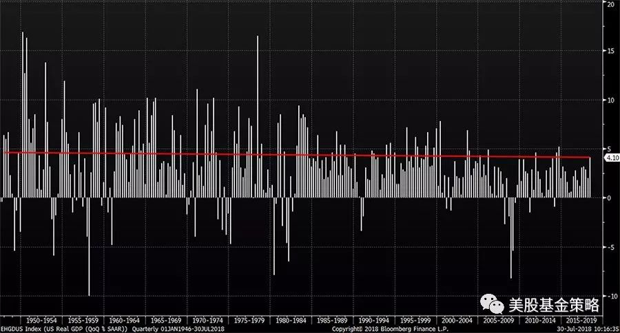 美国GDP最新的季度增速高达4.1%,让我们看看上图这条4.1%的红线划过美国1950年以来的季度GDP增长,感受下其地位。是的,这是美国近4年来,最高的季度增幅,在美国进入21世纪之后也是非常强劲的表现。所以,这种情况下,我个人判断,美国股市依然有上升空间,当然伴随通胀、加息,这种上升必然是伴随高频次但是有限幅度的波动推进。这样的背景下,那些对利率敏感的,或者高负债的投资标的需要注意风险,谨慎买入和持有,美元也依然有继续上升的空间,新兴市场依然不值得仓位过重。