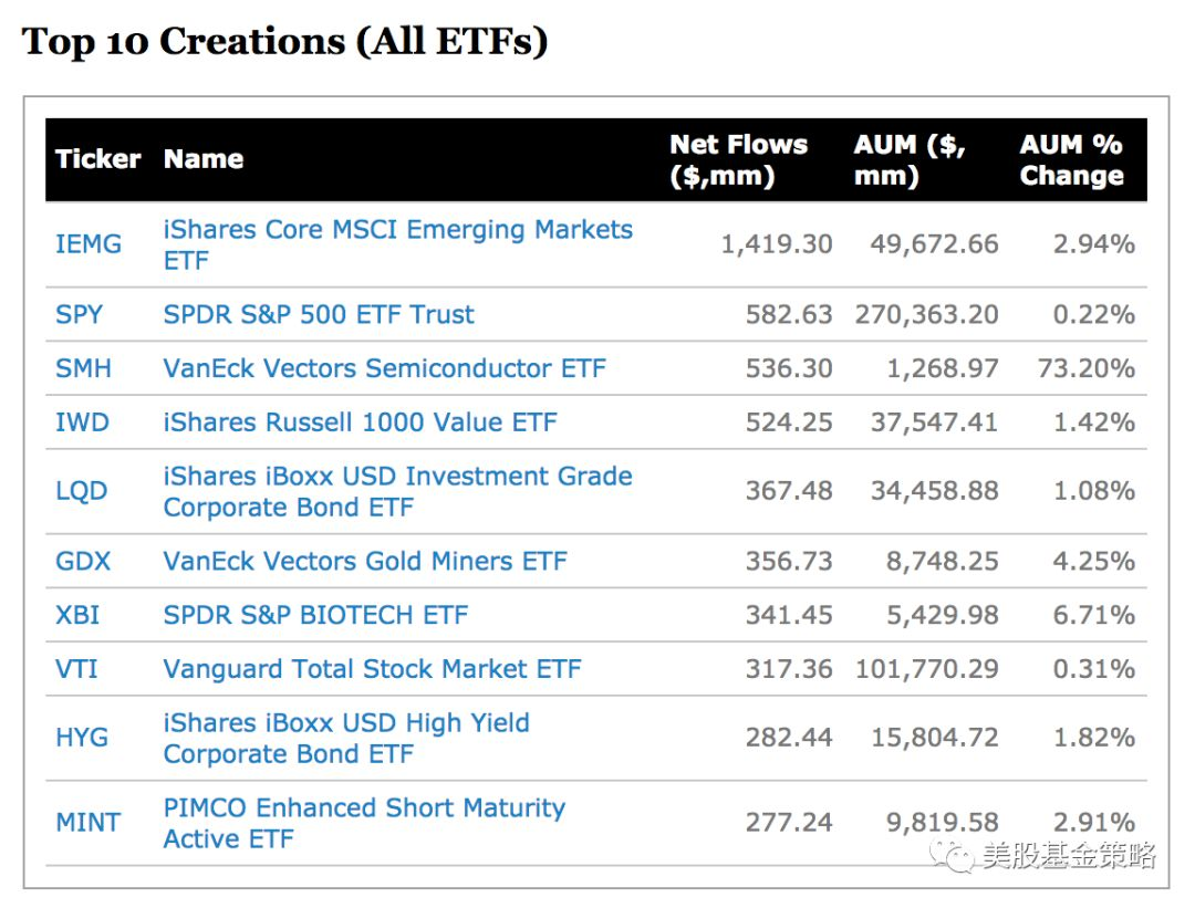 本周资金流入幅度最大的则是半导体主题基金SMH,净流入5.36亿美元,规模增幅高达73%。此前,我多次介绍过规模更大的半导体基金SOXX,两只ETF的区别在于挂钩的指数不同,所以成分股在仓位比例上会有所区别。