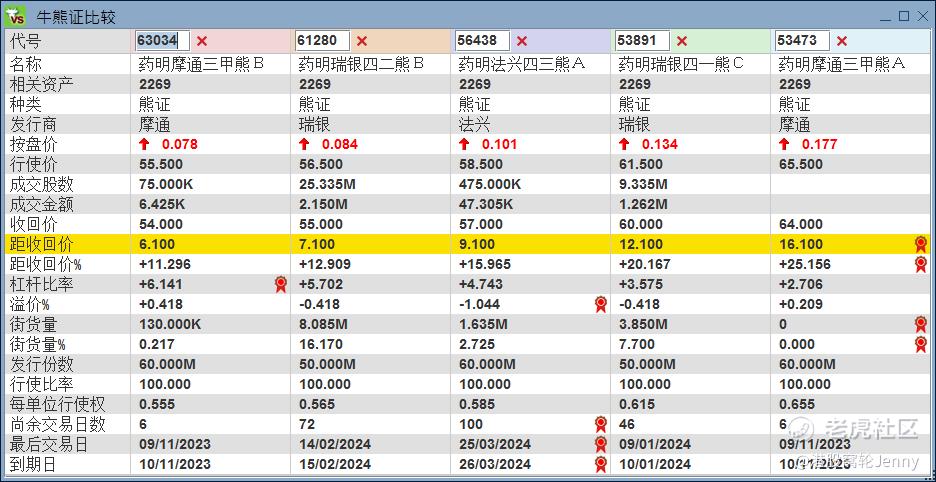 市场上亦有投资者会利用熊证捕捉看淡交易机会,因为熊证杠杆往往比认沽证高,不过,投资者要留意,熊证有收回机制,所以对于收回价的考虑应比较保守。收回价54元的63034,实际杠杆6.05倍。另外相对稍远的熊证产品有61280,收回价55元,杠杆4.9倍,2024年2月份到期,条款相近的产品只有1只。