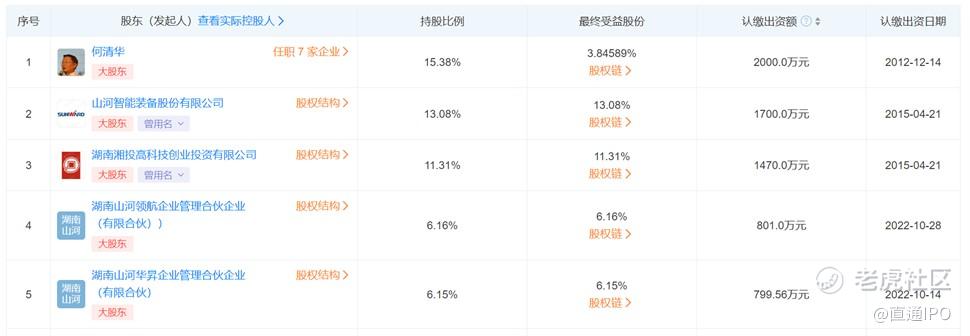 据悉,截至当前,在山河星航股权结构中,创始人何清华为控股股东、实际控制人,直接持股比例为15.38%股份,通过两家合伙企业湖南山河领航企业管理合伙分别控制公司6.16%和 6.15%股份,合计持股比例为27.69%,并且拥有山河星航 54.03%表决权,为公司实际控制人。