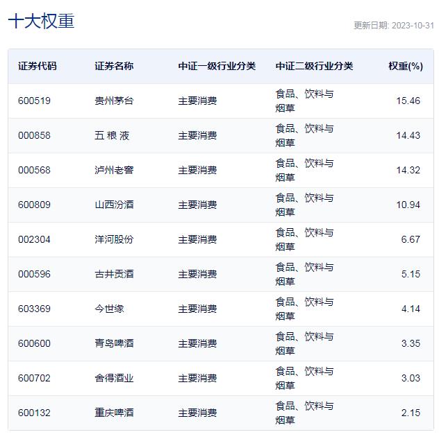 中证细分食品饮料产业主题指数涵盖沪深食品制造等行业相关细分产业公司,涉及白酒、调味发酵品、乳品、啤酒、保健品、软性饮料、烘焙食品等多个行业,其中,白酒权重保持在60%左右。其前十大成分股权重合计超70% ,呈现高集中度特征。