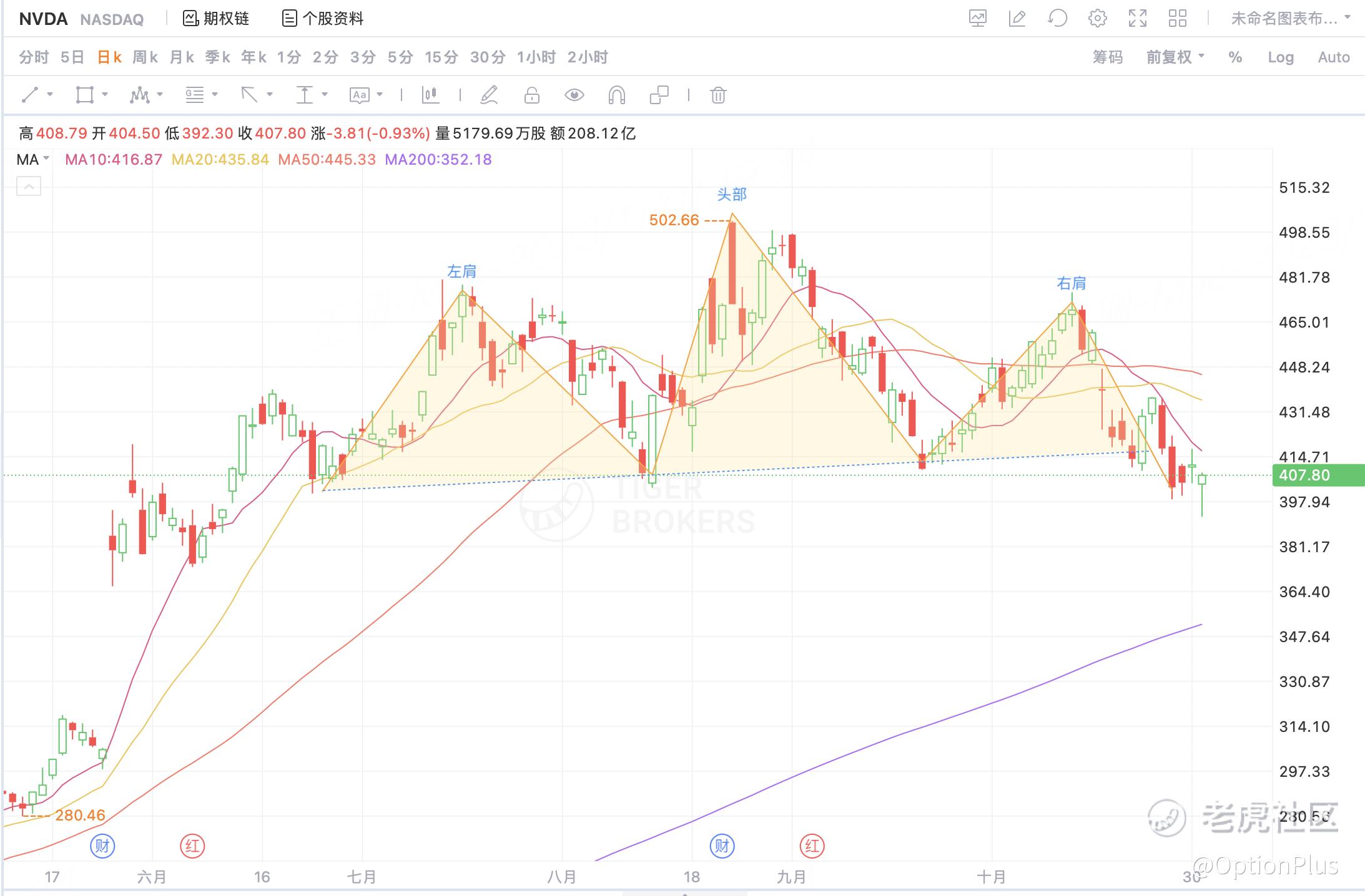 $英伟达(NVDA)$ 之前有NVDA 400的SP,10月到期后没有开新的,看到本周破了400过。50亿美元的订单损失是实际影响,从技术面看典型头肩顶,非常确定。也许大盘反弹会让400上下形成有效支撑,但目前暂时不会做新的Sell put,等月底财报后在判断。