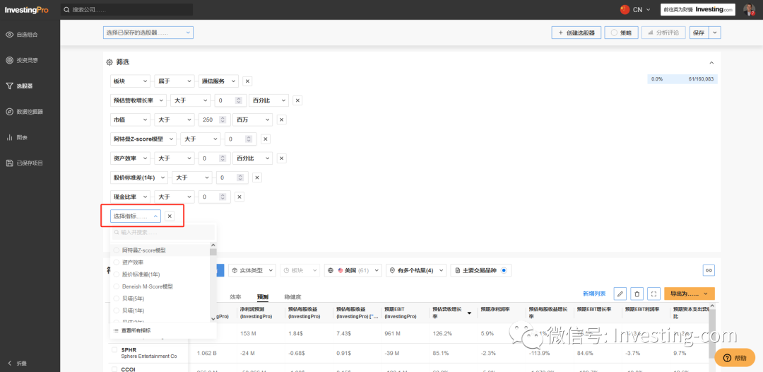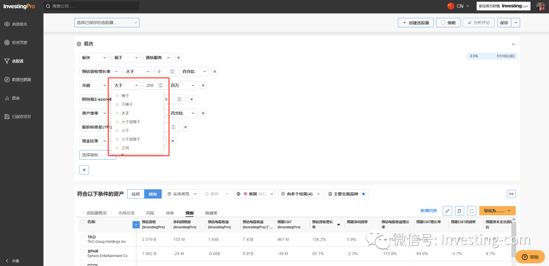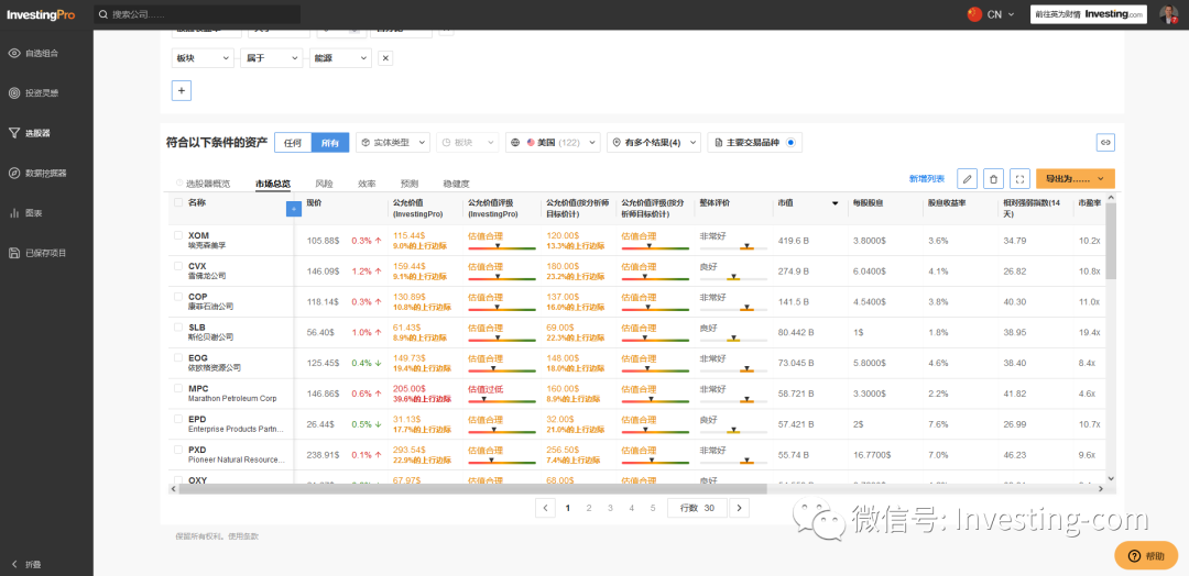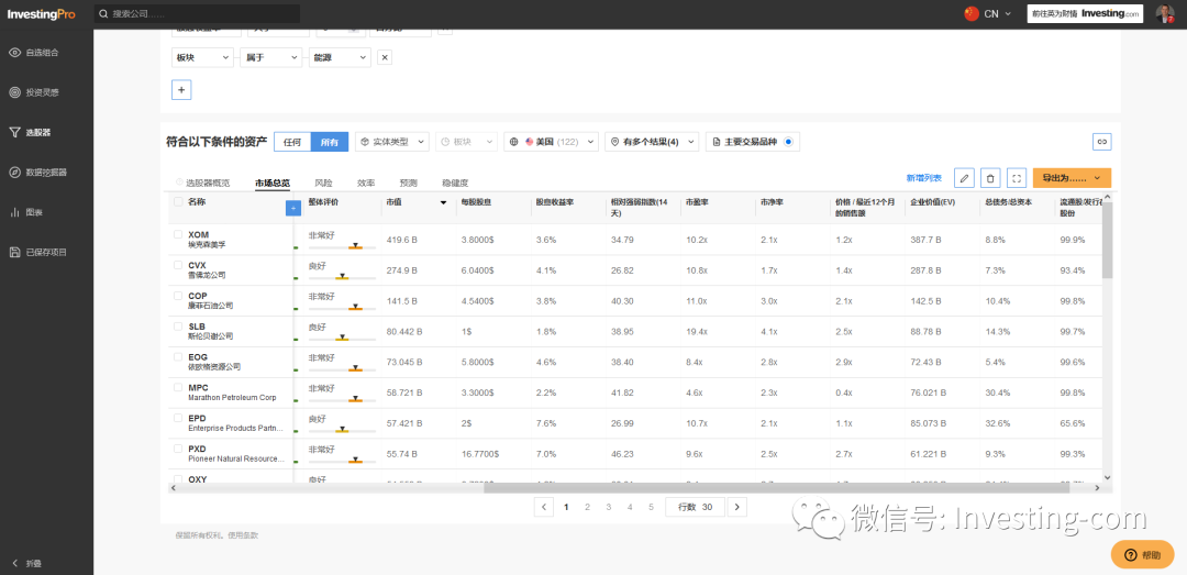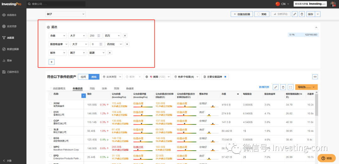 选好后,InvestingPro就会显示符合你要求的股票列表: