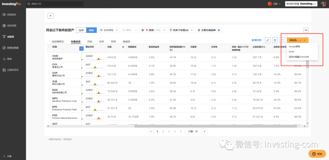 InvestingPro选股器的筛选结果是可以保存的,如有需要,可以点击页面右上方的“导出为”。