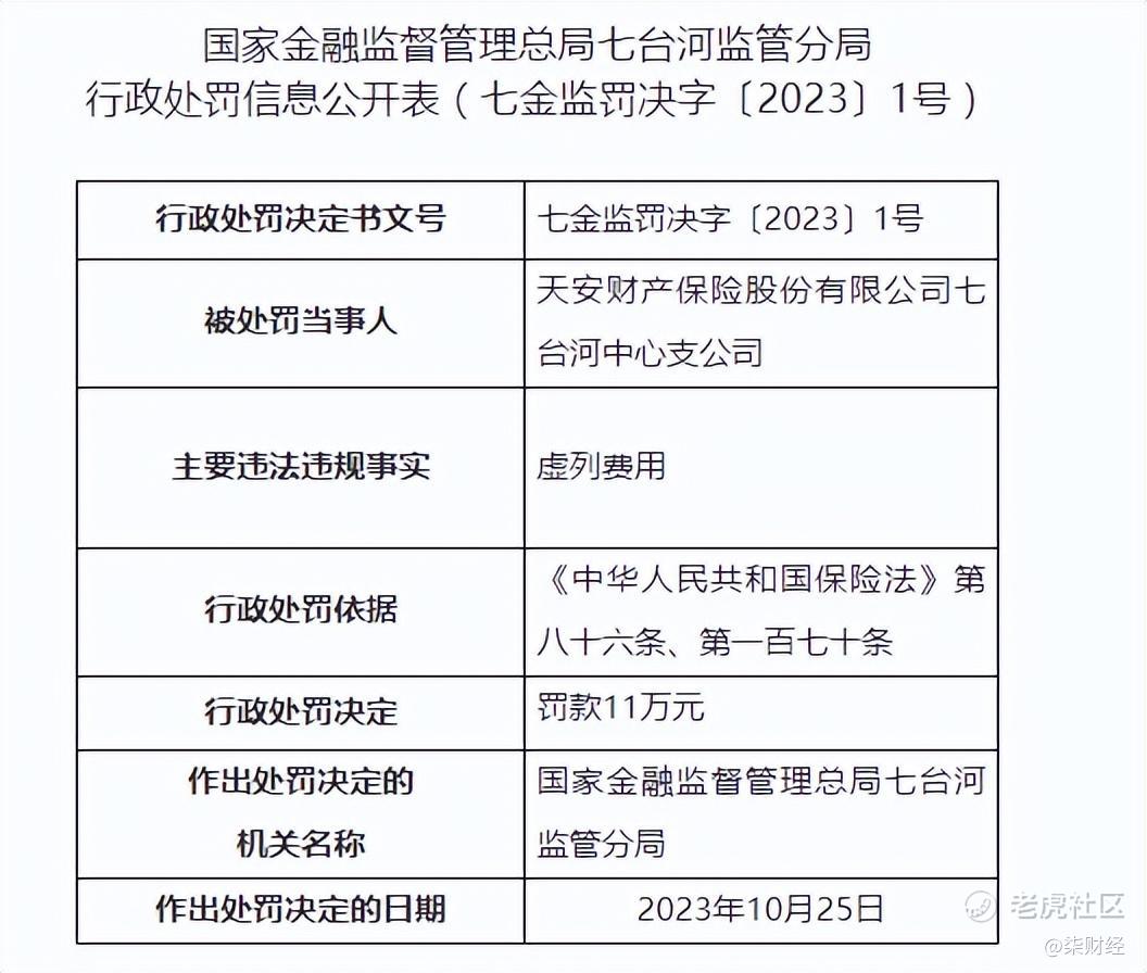 11月2日,据国家金融监督管理总局七台河监管分局公布的行政处罚信息,天安财产保险股份有限公司七台河中心支公司(下称天安财险七台河中支)因虚列费用,被罚11万元。