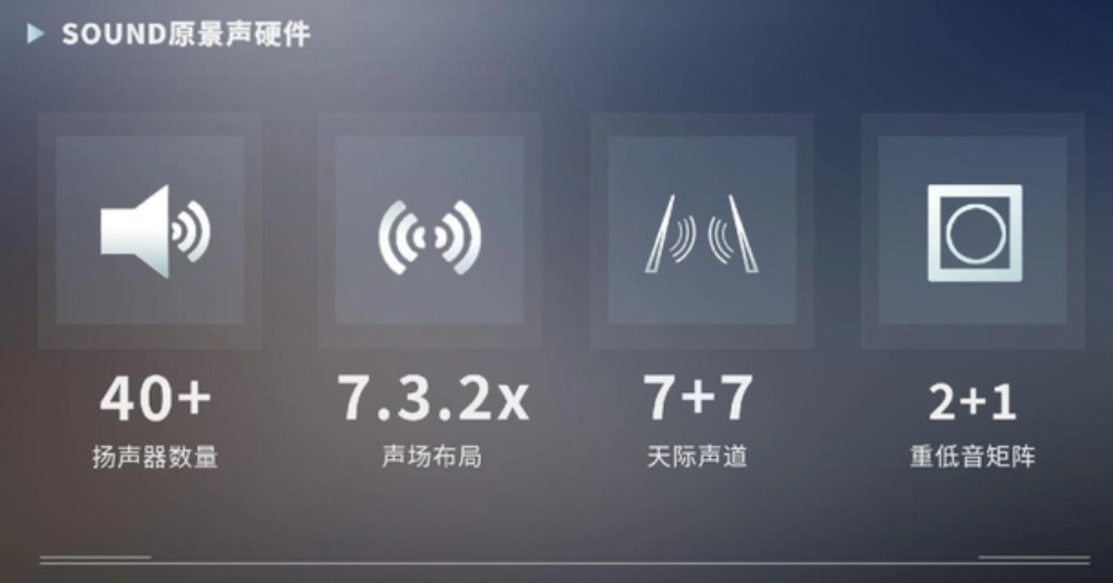 ADiGO SOUND原景声同样让人震撼。ADiGO SOUND搭载超过40个扬声器,采用7.3.2x的声场布局,也即7个环绕声道、3个高低音声道和2x个天空通道,其中后者是ADiGO SOUND和其他座舱音响拉开差距的地方。按照官方的说法,其支持车顶双侧7+7的扬声器阵列,故而能结合独特的声腔设计与专属的音效调校,带来空灵、悠扬的天际声音体验。