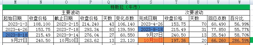 特斯拉从今年的底部103低点,上升到7月的299高点,上涨196点,主要波动历经145天。次级回调到低点194,历经105天,回应点数105点,回踩幅度53.57%。