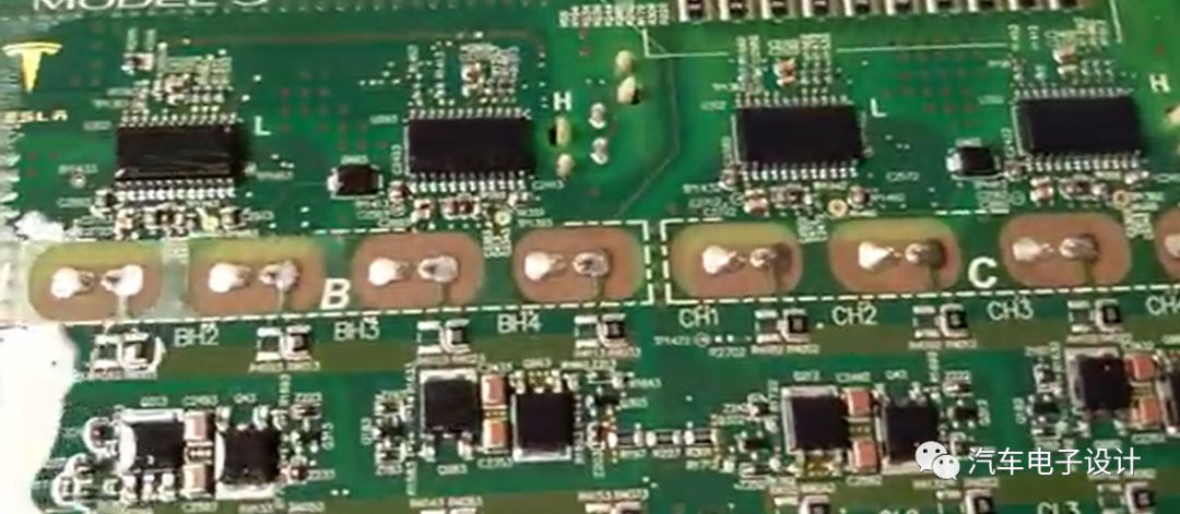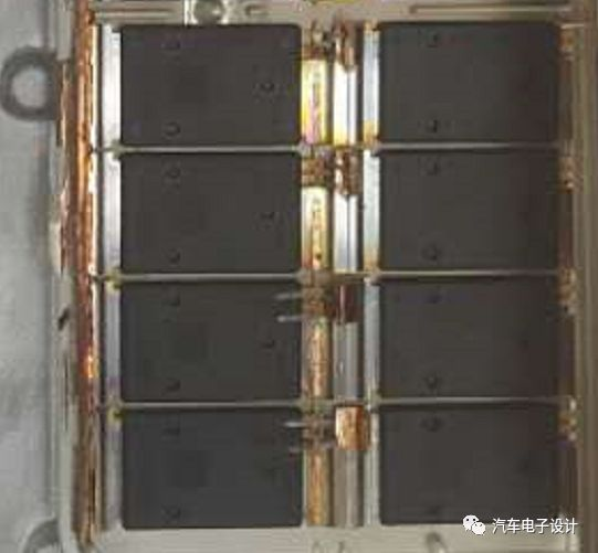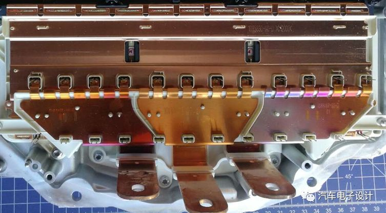 如下图所示,实际的连接还有很多的细节,在拆解过程中发现,为了有效的做好这些连接,使用了大量的激光焊接的工艺,来把MOSFET与铜母线相连。