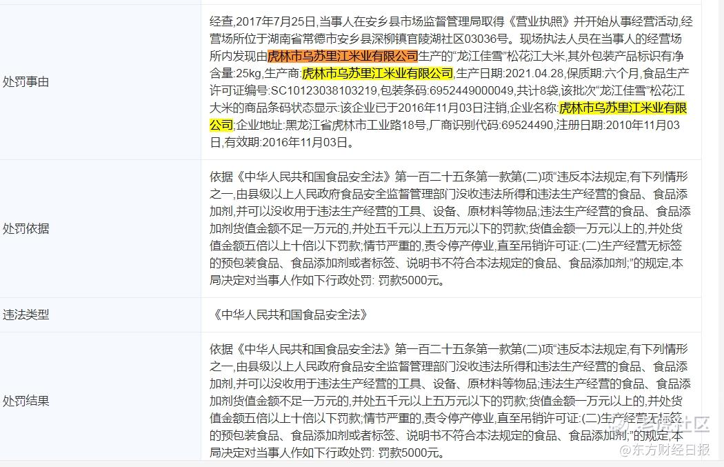 再回头看虎林市乌苏里江米业有限公司,早在2017年就被处罚过。