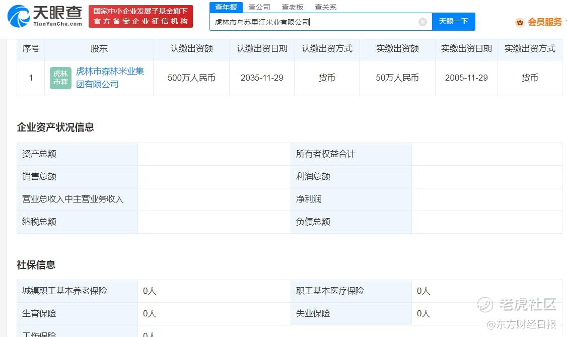 发现生产商是虎林市乌苏里江米业有限公司,公司成立倒是蛮久的,2005年12月成立,至今已经18年了。