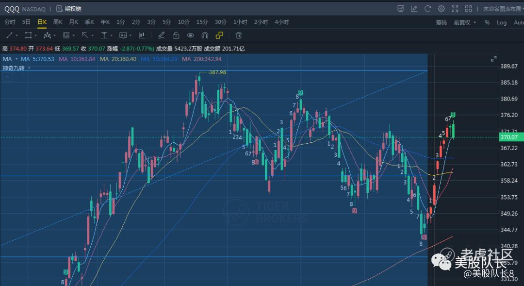 今天QQQ上涨到九转的顶部9,如果完成九转形态的话,今天收盘价不会低于周一收盘价269.21。所以我预计今天日内走势是上涨或者震荡,如果出现低点,要果断做多。因为有震荡的可能,止盈可以采取分批止盈的策略。在高点也是可以尝试做空的机会。 $纳斯达克(.IXIC)$