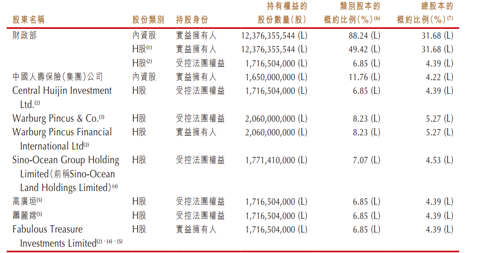 公司最大股东为财政部,合计持有公司67.75%股权。中国人寿保险持有共16.5亿股占公司总股本的4.22%。中央汇金公司持有17.16亿股,持股比例为4.39%。