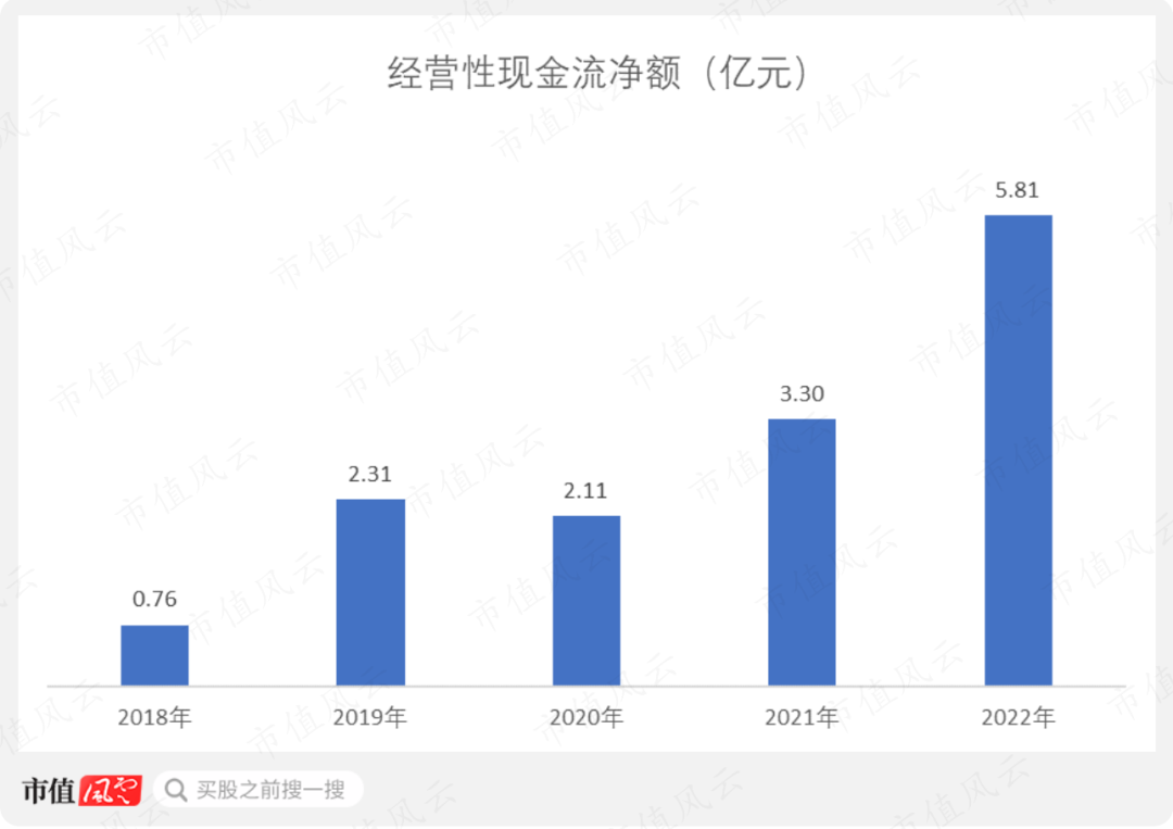 与此同时,公司经营性现金流的表现也不错。经营性现金流净额从2018年的0.76亿元增长至2022年的5.81亿元。