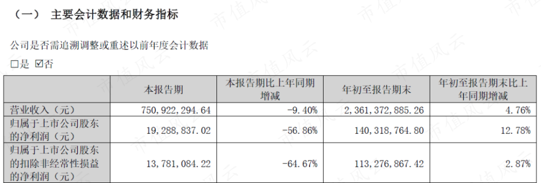 根据最新的财报,今年第三季度公司营收和扣非归母净利润同比分别减少了9%和65%。第三季度表现较差,直接拖累了前三个季度的整体表现。今年前三季度的营收同比只增长了5%,扣非归母净利润同比只增长了3%。