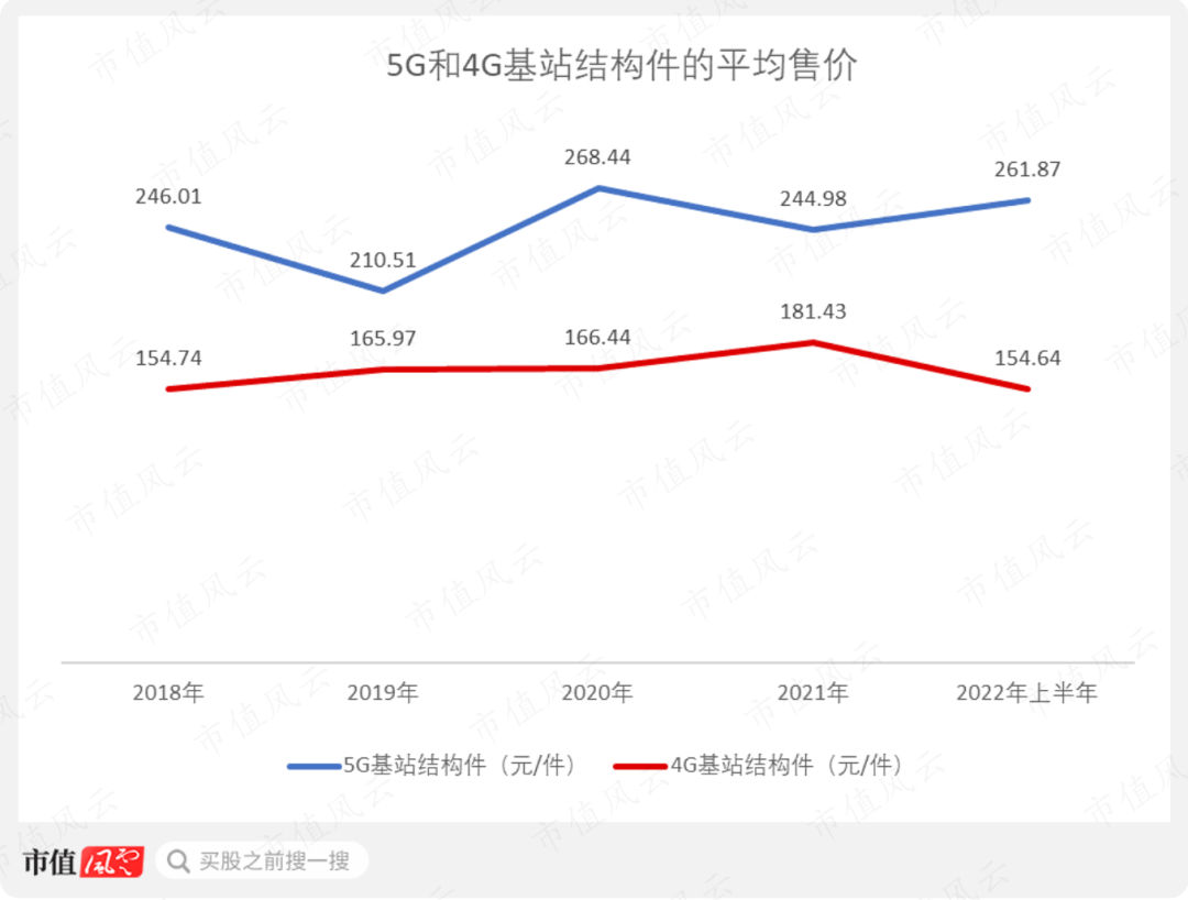 2018-2022年上半年,5G基站结构件的平均售价保持在200元/件以上,而4G基站结构件的平均售价明显要比5G基站结构件低,其价格大致在150-170元/件之间,最高不超过190元/件。