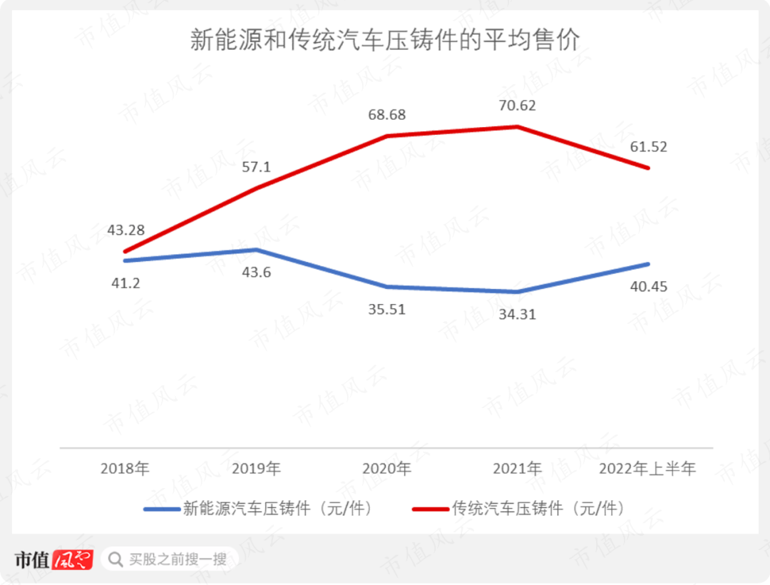 新能源汽车压铸件的价格比传统汽车压铸件便宜,前者的平均售价在40元/件左右,后者则基本保持在60元/件以上。
