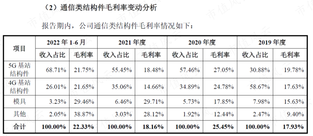 2018年,4G基站结构件还是公司的第一大收入来源,其占营收的比重接近50%,到了2022年上半年,其占营收的比重就只有15%,是四个细分产品类别中营收占比最低的。