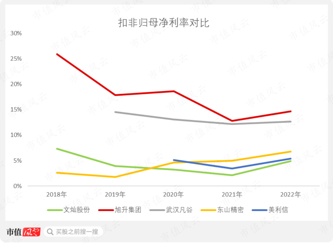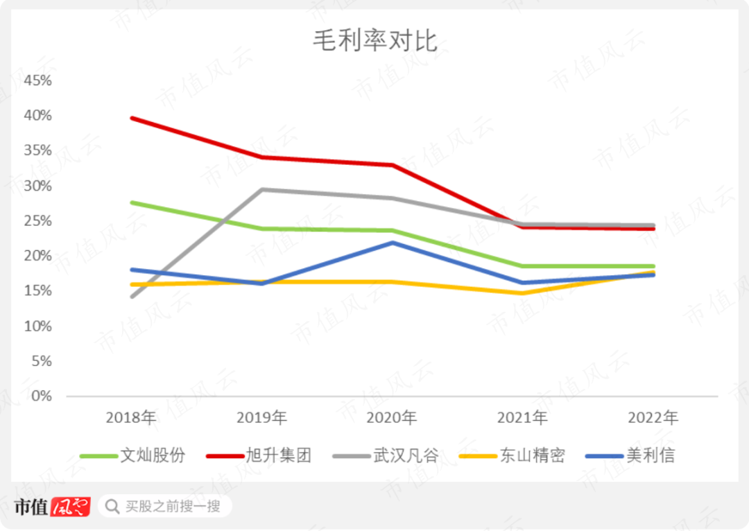2018-2022年,美利信、文灿股份、旭升集团、东山精密以及武汉凡谷这五家企业的毛利率逐渐趋同,且大致在15%-25%区间内变动。