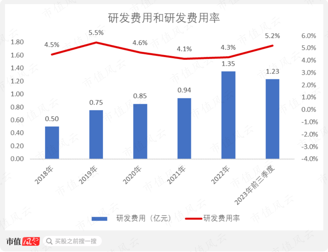 公司研发费用从2018年的0.5亿元逐年增长至2022年的1.35亿元,研发费用率长期保持在5%左右。截至2023年上半年末,公司已获授权专利199项。