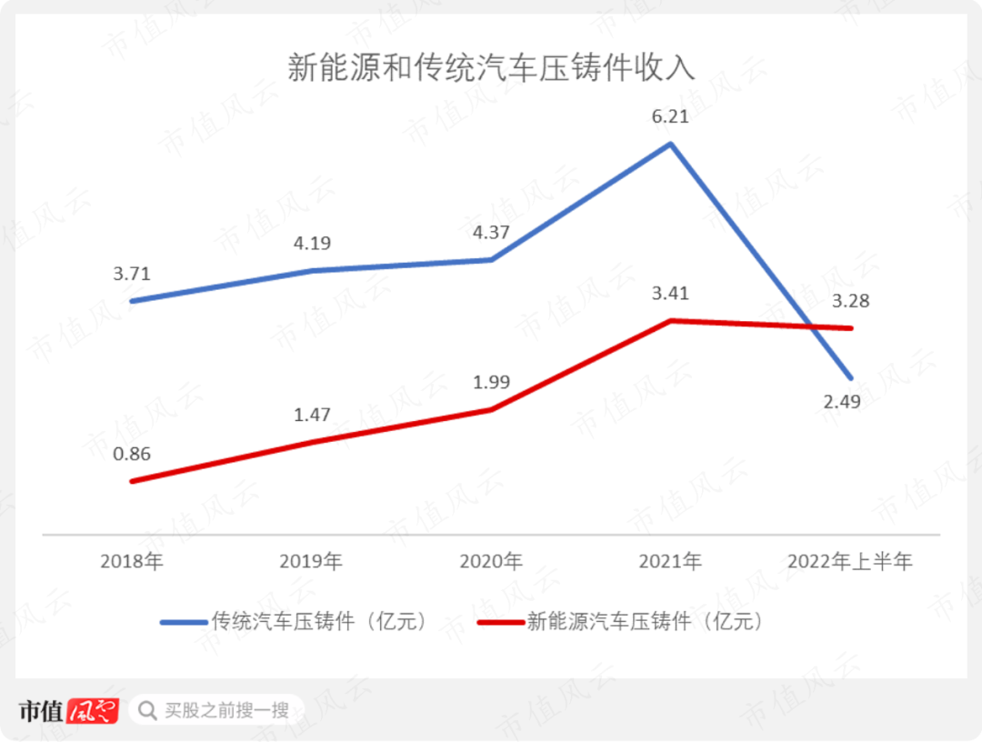 2022年上半年,新能源汽车压铸件业务表现依旧亮眼,其上半年收入为3.28亿元,快赶上去年全年的收入(3.41亿元)了。而传统汽车压铸件在2022年上半年的收入为2.49亿元,不到去年全年收入(6.21亿元)的一半。