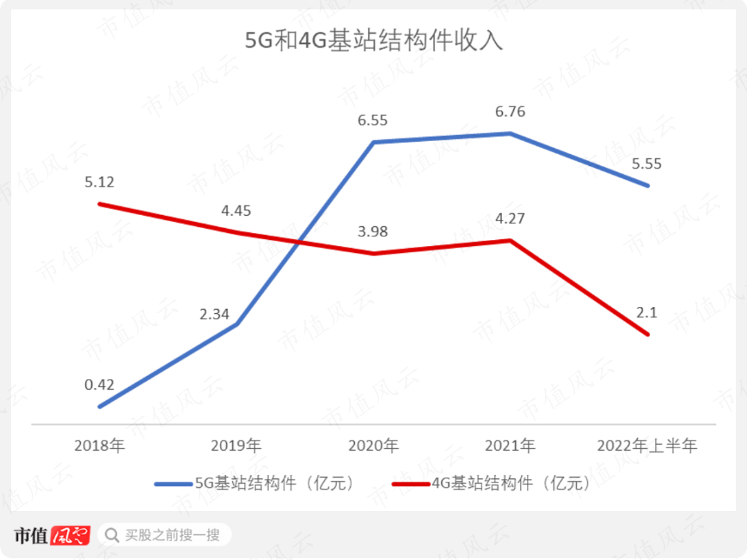 纵向看,随着通信行业技术的迭代,4G基站的更新建设项目逐步减少。公司的4G基站结构件收入从2018年的5.12亿元减少至2021年的4.27亿元。