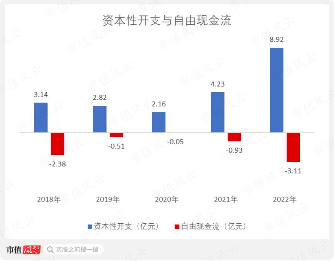 公司每年的资本性开支比较多,2022年的资本性开支更是达到8.92亿元,是近五年来的最高值。